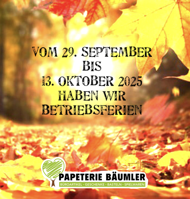 - Schulferien = Betriebsferien vom 29. September bis 13. Oktober bleibt unsere Papeterie geschlossen. Wir freuen uns Sie davor und danach wieder in unserer Papeterie zu begrüssen.