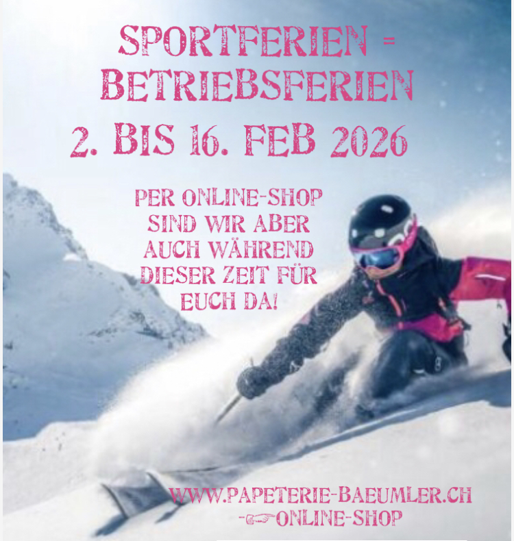 • Sportferien = Betriebsferien vom 2. bis 16. Februar bleibt unsere Papeterie geschlossen. Wir freuen uns Sie davor und danach wieder in unserer Papeterie zu begrüssen zu dürfen. Valentinstagsgeschenke darum unbedingt vorher kaufen ;-).