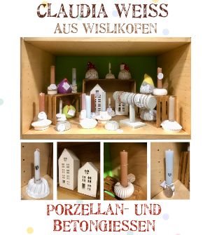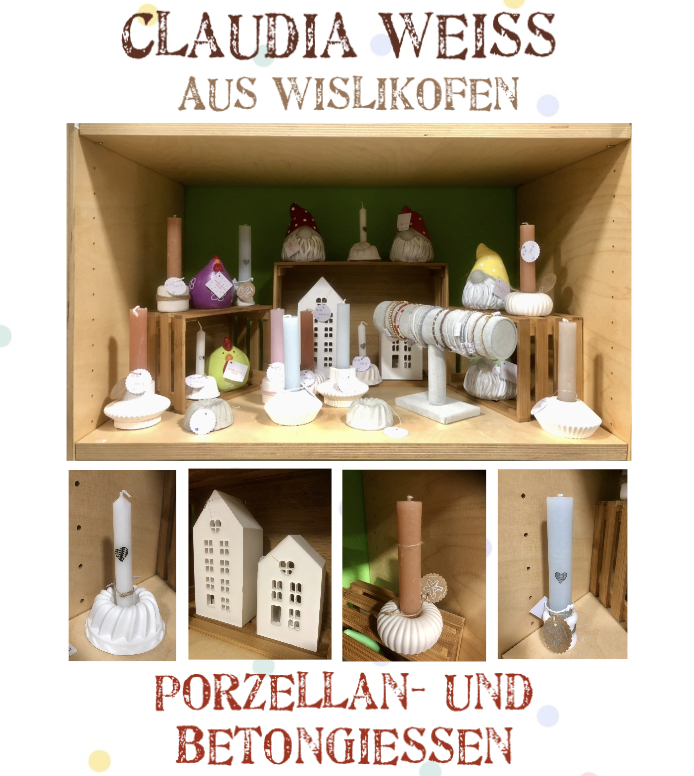 Claudia Weiss' Hobby ist das Beton- und Porzellan-Giessen. Sie holt sich Ihre Inspiration an Märkten oder auch mal im Internet und zaubert daraus mit ihrer Tochter Rahel feine Armkettchen, giesst mit Porzellanpulver zarte Kerzenhalter🕯️ und Teelichhäuschen🏠 und fertigt aus Betonmasse wetterfeste Gartenzwerge. Kleine Mitbringsel zum Verschenken oder selber behalten🥰. Entdeckt dieses feine Handwerk jetzt bei uns