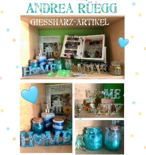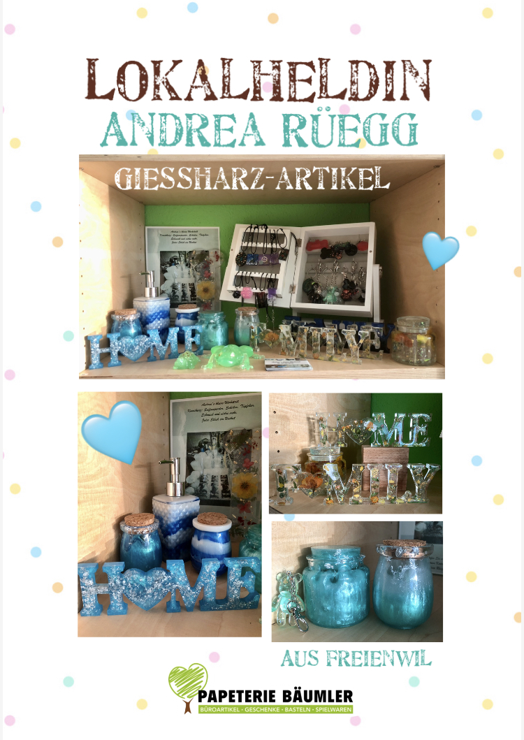 Andrea Rüegg zeigt Euch ihre einzigartigen Giessharz-Kreationen: von Seifenspendern über Schmuck & Schalen bis hin zu Schlüsselanhängern und Schriftzügen – jedes Stück ein Unikat. 💫 Kommt vorbei, lasst Euch inspirieren und unterstützt eine neue Künstlerin mit Herz und Hand. Ob als hübsche Deko in Eurer Wohnung, als Hingucker😍 in einem Geschenkkorb, als Mitbringsel zu einer Einladung - einfach Freude pur und ein Handwerk, so professionell und mit soviel Herz gestaltet.