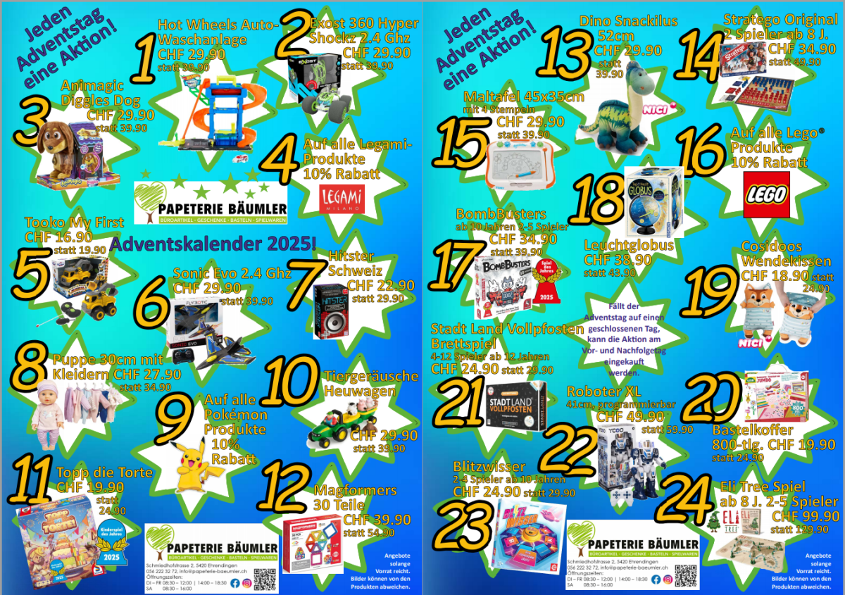 Büromaterial, und vieles mehr, zum Bestellen und portofreien Abholen in unserem Ladengeschäft, oder als Heimlieferung gegen Rechnung. Finden Sie etwas nicht, melden Sie sich, wir können fast alles bestellen. Vieles mehr und anderes gibt’s in unserem Ladengeschäft. Schauen Sie vorbei, rufen Sie an oder schreiben Sie uns.